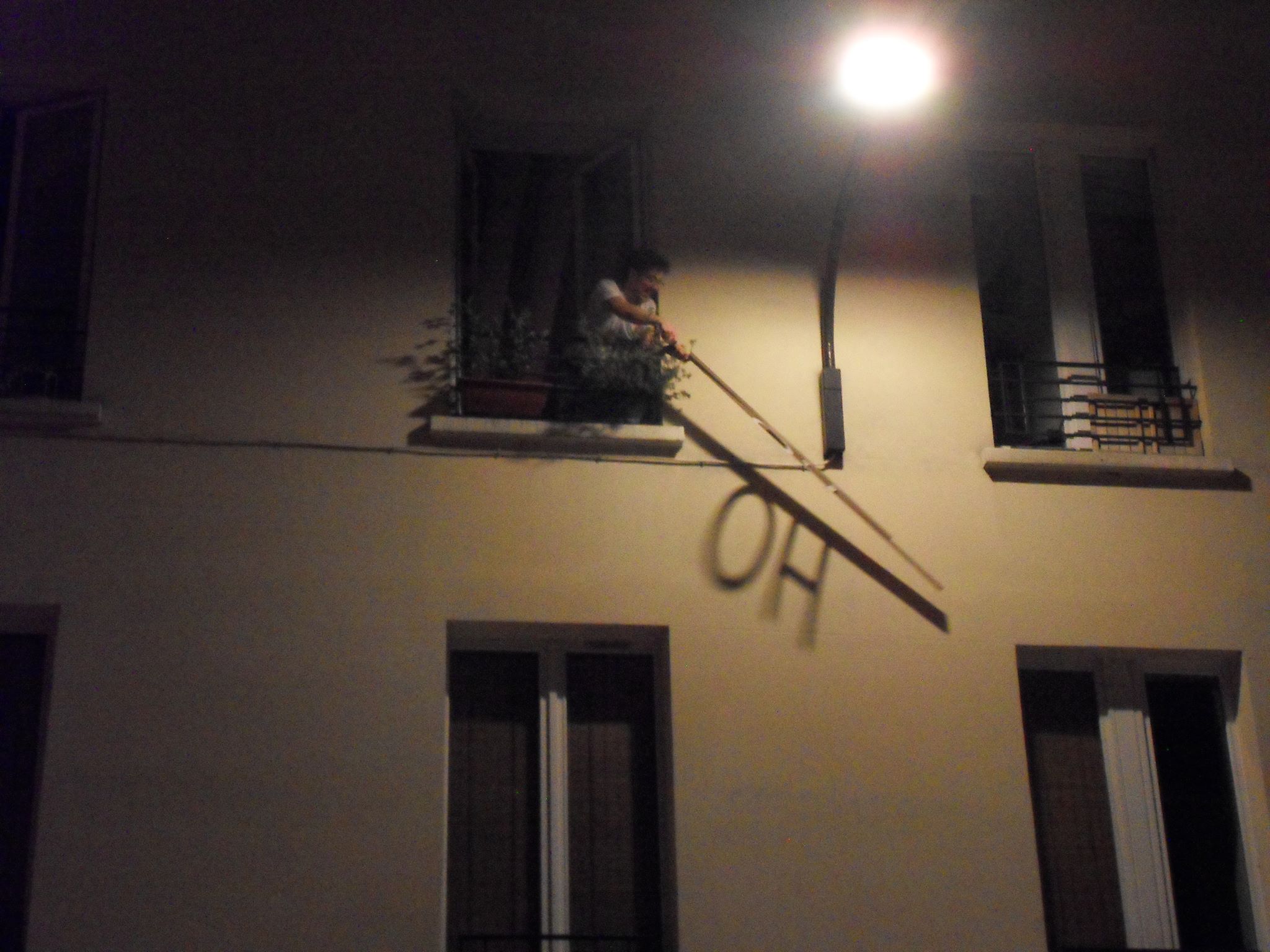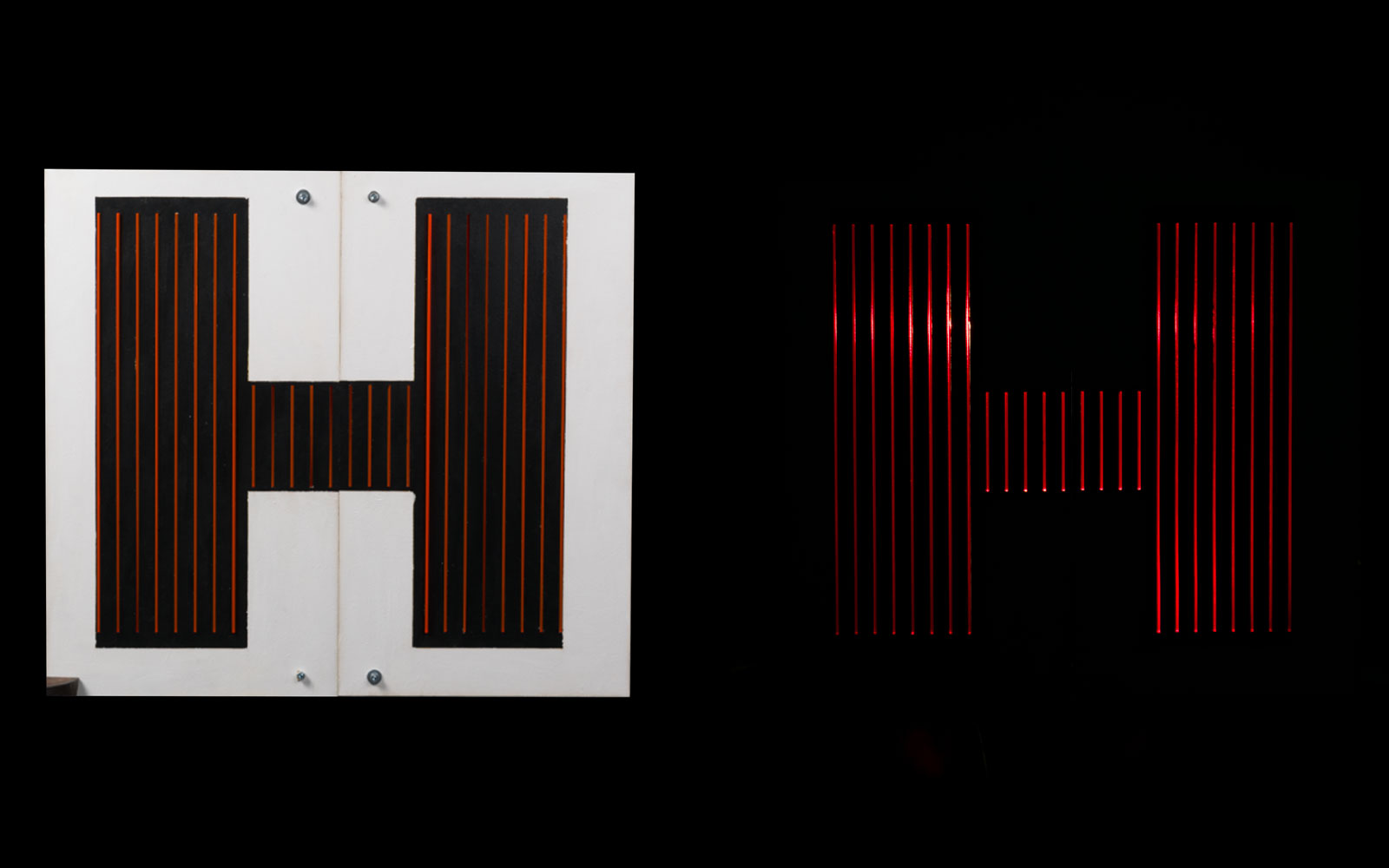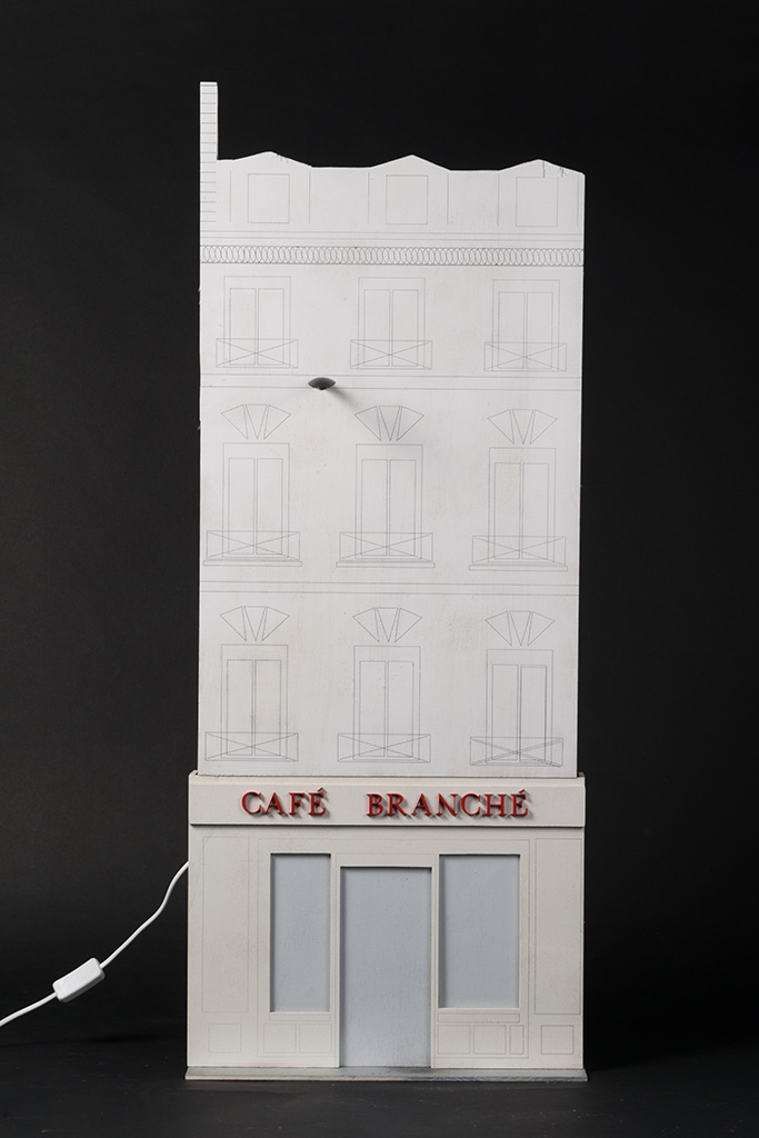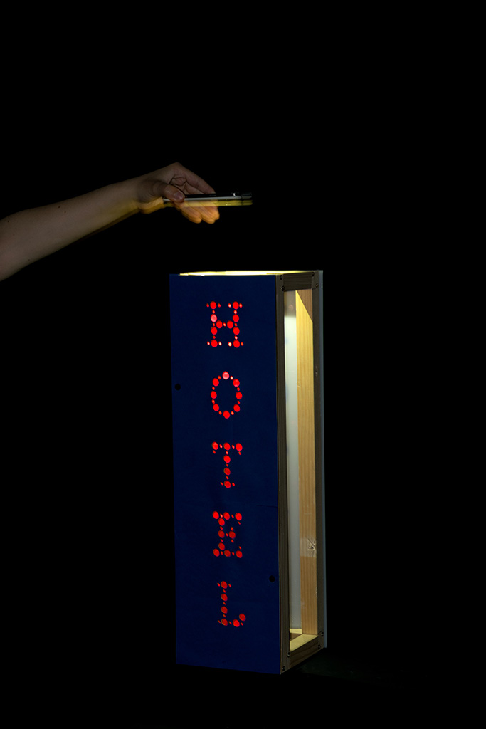 Lorsqu'un lampadaire public est placé sur cette même façade, il est courant d’observer une enseigne directement sous cette source de lumière. Utiliser cette énergie déjà existante semble logique. Le PMMA est un matériau qui agît à la façon de la fibre optique : il restitue la lumière qu’il capte au bout de sa tige. Placé directement sous la source de lumière, il donne l’impression de LED allumées. Nous pouvons ainsi créer un language graphique qui peut se différencier entre l’affichage visible de jour et celui la nuit.